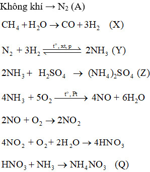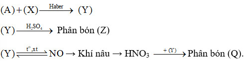 Sơ đồ quy trình dưới đây mô tả các bước trong quá trình sản xuất một số loại phân bón. Hãy xác định các chất (A), (X), (Y), (Z), (Q). Viết các phản ứng hoá học xảy ra.