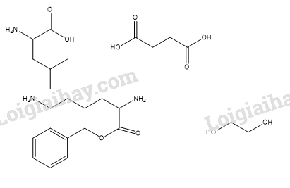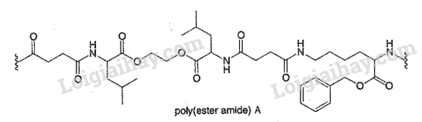 Polymer A thuộc loại poly(ester amide) được sử dụng trong dược phẩm để giải phóng thuốc có kiểm soát. Sau khi uống, các enzyme của cơ thể nhận biết các amino acid tự nhiên trong mạch polymer và phân cắt tại các vị trí này làm thuốc được giải phóng một cách từ từ. A được tổng hợp từ bốn monomer gồm hai monomer đa chức, hai monomer là amino acid và dẫn xuất của amino acid. A có công thức cấu tạo như hình sau đây.