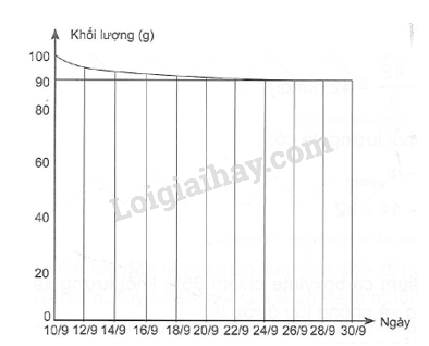 Một nhóm học sinh điều chế xà phòng theo phương pháp đã nêu trong sách giáo khoa Hoá học 12 (Chân trời sáng tạo). Thành phẩm là những bánh xà phòng được nhóm bảo quản nơi thoáng mát, khối lượng ban đầu của mỗi bánh là . Để hoàn thành báo cáo kết quả thực hành, nhóm đã tiến hành cân khối lượng bánh xà phòng cứ hai ngày một lần và việc này thực hiện liên tục trong vòng 18 ngày, bắt đầu từ ngày tháo khuônn**). Kết quả được thể hiện bởi biểu đồ quan hệ giữa cân nặng của bánh xà phòng theo thời gian như sau: