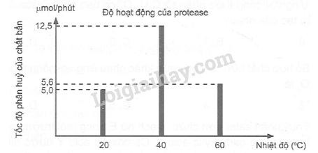 Các mẫu thí nghiệm được tiến hành ở 3 nhiệt độ khác nhau, với mục đích xác định độ hoạt động tối ưu của protease ở các nhiệt độ khảo sát. Trên biểu đồ, tốc độ phân huỷ chất bẩn đạt mức cao nhất là \(12,5\,\,\mu {\rm{mol}}/\)phút ở \({40^ \circ }{\rm{C}}\) nên độ hoạt động của protease trong thí nghiệm là tối ưu ở nhiệt độ trên.