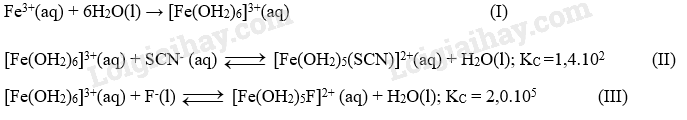 Biết dung dịch [Fe(OH2)6]3+ màu vàng nâu, dung dịch [Fe(OH2)5(SCN)]2+ có màu đỏ, dung dịch [Fe(OH2)5F]2+ và các anion SCN-, F- đều không có màu.