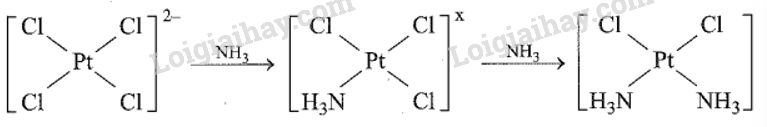 Phức chất [Pt(NH3)4]2+ có thể bị thế bởi 1 phối tử Cl-. Phức chất tạo thành có điện tích là +1 vì phức chất được tạo thành có dạng [PtCl(NH3)3]+x, ta có: 2 + (-1) + 0 = x → x = + 1.