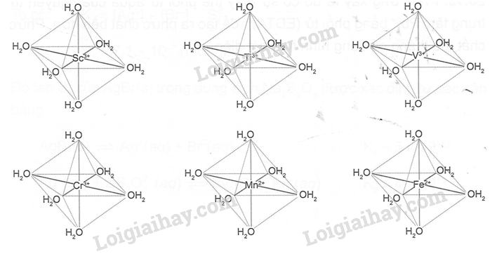 Lấy 5 ví dụ phức chất aqua của 5 nguyên tố kim loại chuyển tiếp dãy thứ nhất. Biểu diễn dạng hình học của phức chất trong các ví dụ.