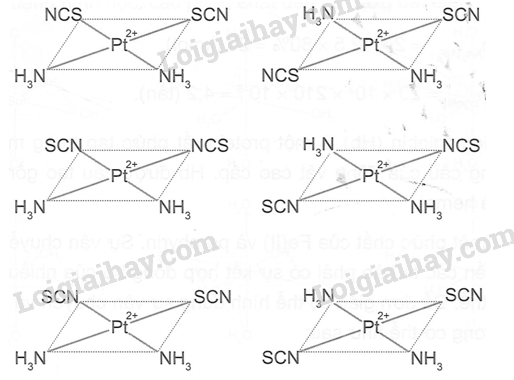 Phức chất [Pt(NH3)2(SCN)2] có hai loại đồng phân (đồng phân cis – trans và đồng phân liên kết). Biểu diễn dạng hình học của các đồng phân phức chất.