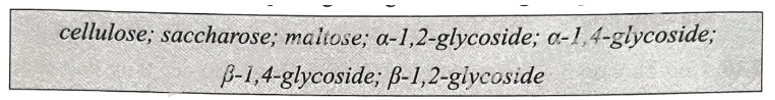 a) (1) cellulose; (2) α – 1,4 – glycoside.