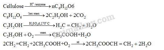 Vinyl acetate được dùng để tổng hợp poly(vinyl acetate), một loại polymer được sử dụng nhiều trong công nghiệp gỗ, công nghiệp dệt,… Vinyl acetate có thể được tổng hợp hoàn toàn từ sinh khối (tinh bột hoặc cellulose). Viết các phương trình hóa học để tổng hợp vinyl acetate từ cellulose.