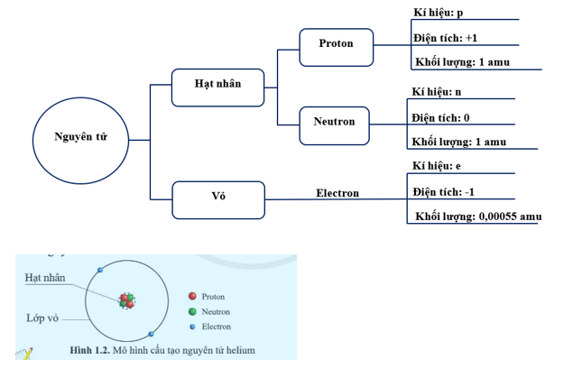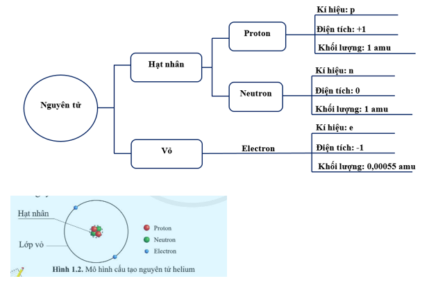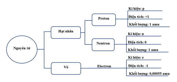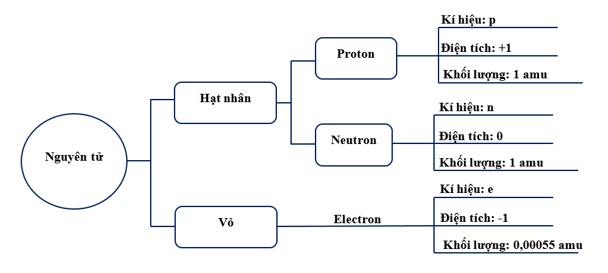 + Hạt nhân gồm các hạt proton (mang điện tích dương) và neutron (không mang điện).