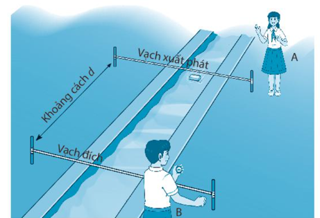 - Bạn A thả vật nổi và ra tín hiệu để bạn B bấm đồng hồ bắt đầu đo. Bạn B quan sát vật nổi chạm vạch đích thì bấm đồng hồ dừng đo và đọc kết quả đo thời gian t.