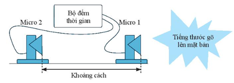 Hình dưới đây mô tả một cách đo tốc độ lan truyền âm thanh trong không khí, bằng cách tạo ra tiếng thước gõ lên mặt bàn. Hai micro được kết nối với bộ đếm thời gian. Các cảm biến gắn trong bộ đếm thời gian thu nhận tín hiệu âm thanh đến mỗi micro và hiển thị trên màn hình khoảng thời gian từ lúc micro 1 nhận tín hiệu đến lúc micro 2 nhận tín hiệu.