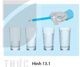 Em có thể làm thí nghiệm để tạo ra một giai điệu với các âm thanh trầm bổng khác nhau từ những chiếc cốc thủy tinh như sau: Xếp những chiếc cốc thủy tinh thành hàng (H13.1). Cho vào cốc thứ nhất một ít nước, cốc thứ hai nhiều hơn cốc thứ nhất, sau đó cứ tăng dần mực nước lên. Dùng bút chì gõ vào chiếc cốc ít nước nhất và lắng nghe âm thanh. Rồi gõ vào chiếc cốc có nhiều nước nhất và để ý sự khác biệt giữa hai âm thanh. Cho biết cốc nào âm thanh trầm hơn?
