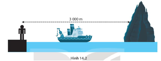Một người đứng trên mép hòn đảo cách vách núi phía trước 3000 m, giữa vách núi và hòn đảo có một chiếc tàu thủy neo đậu (H14.2). Khi tàu hú còi, người này nghe thấy hai tiếng còi cách nhau 4s. Xác định khoảng cách từ đảo tới tàu. Biết tốc độ truyền âm trong không khí là 340m/s.