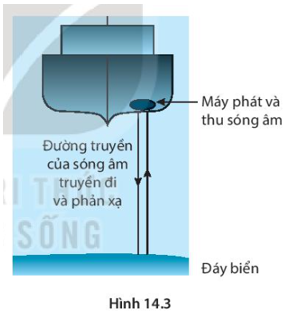 Người ta ứng dụng hiện tượng phản xạ sóng âm để đo độ sâu của biển. Sóng âm có tần số cao (siêu âm) từ con tàu trên mặt biển phát ra truyền tới đáy biển (H14.3). Tại đó sóng âm bị phản xạ trở lại và được một thiết bị trên tàu ghi lại. Trong một phép đo độ sâu của đáy biển người ta ghi lại được từ lúc phát ra siêu âm đến khi nhận được âm phản xạ là 1,2s. Biết tốc độ truyền âm trong nước biển là 1 500 m/s. Tính độ sâu của đáy biển.