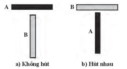 Hai thanh A, B gồm một thanh nam châm và một thanh sắt có hình dạng giống nhau. Thanh nam châm có cực từ ở hai đầu thanh. Khi đặt A và B ở các vị trí như Hình a thì chúng không hút nhau còn khi đặt như Hình b thì chúng hút nhau. Hãy cho biết thanh nào là thanh nam châm và giải thích vì sao.