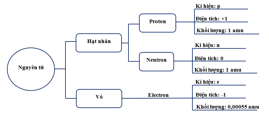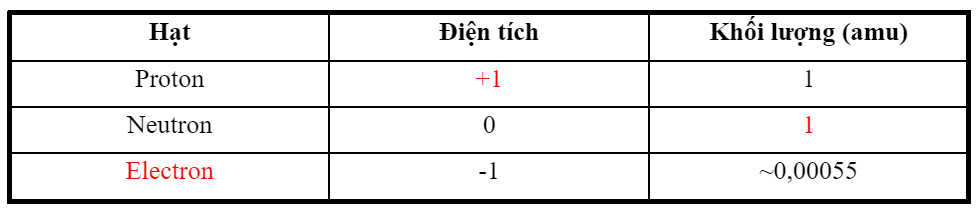 + Hạt nhân gồm các hạt proton (mang điện tích dương) và neutron (không mang điện).