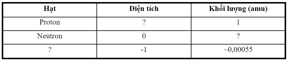 Hãy viết tên, điện tích và khối lượng của các hạt cấu tạo nên nguyên tử vào chỗ trống để hoàn thiện bảng dưới đây.