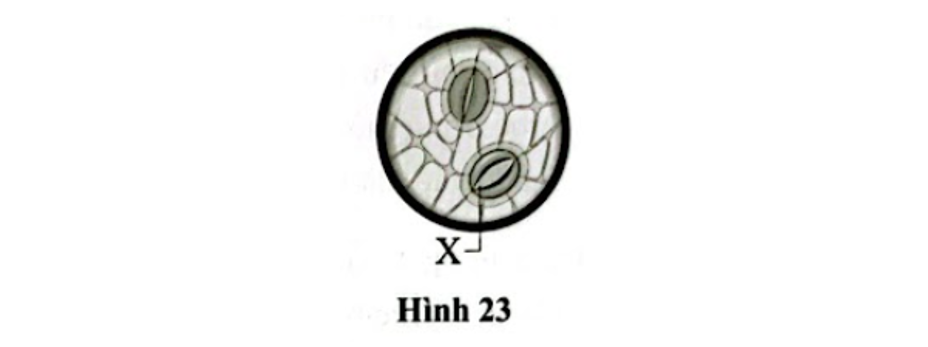 Phần được chú thích X trong hình 23 là khí khổng. Ở khí khổng có hai tế bào hình hạt đậu, xếp úp vào nhau tạo nên khe khí khổng. Các tế bào hạt đậu chứa nhiều lục lạp, có vai trò đóng, mở khe khí khổng.