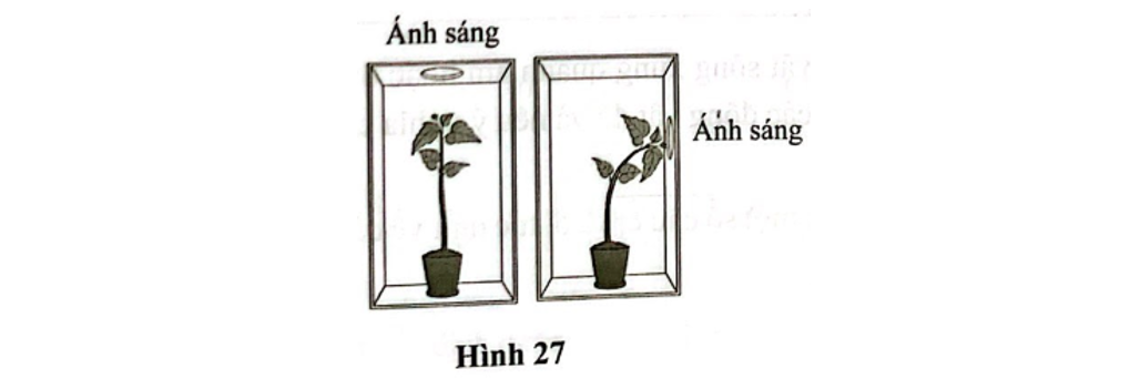 Quan sát hình 27 và nhận xét về hiện tượng thân của hai cây đậu. Giải thích tại sao có sự khác nhau.