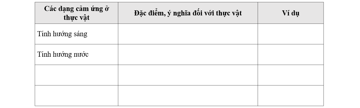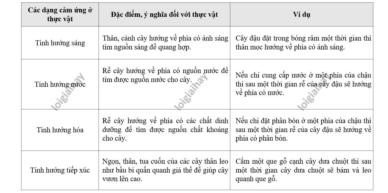 Hoàn thành bảng sau phân biệt một số dạng cảm ứng ở thực vật.