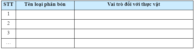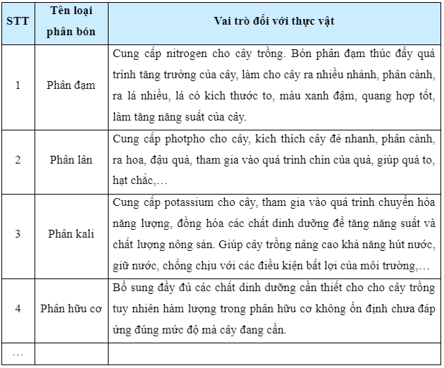 Kể tên một số loại phân bón mà em biết và nêu vai trò của chúng đối với thực vật.