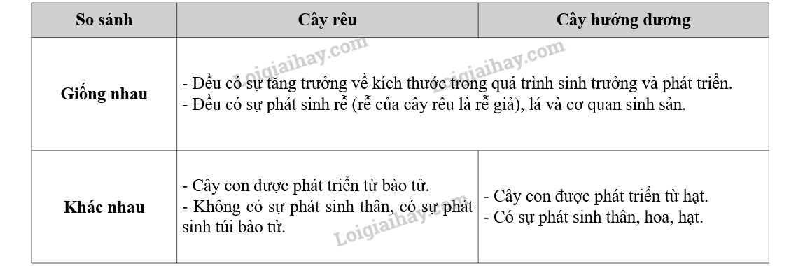 - Những điểm giống nhau và điểm khác nhau về các giai đoạn sinh trưởng và phát triển của cây hoa hướng dương và cây rêu: