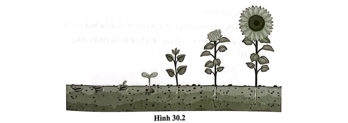 Quan sát hình 30.2 và kể tên các giai đoạn sinh trưởng và phát triển của cây hoa hướng dương. Nêu những điểm giống nhau và điểm khác nhau về các giai đoạn sinh trưởng và phát triển của cây hoa hướng dương và cây rêu ở câu 30.5.