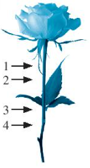 Sau khi ngâm trong dung dịch màu, để xác định vị trí của dung dịch màu trong cành hoa ở hình bên, em sẽ cắt cành hoa bắt đầu từ vị trí nào?