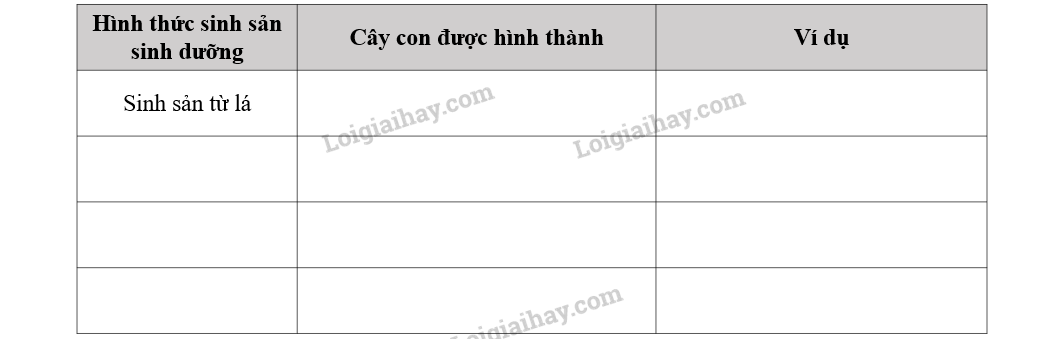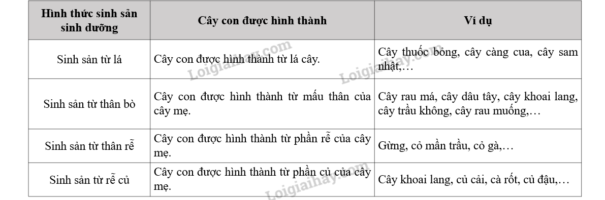 Trình bày các hình thức sinh sản sinh dưỡng ở thực vật theo bảng sau.