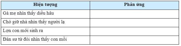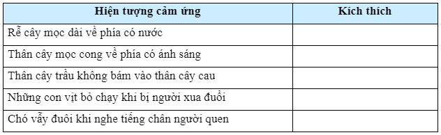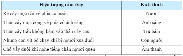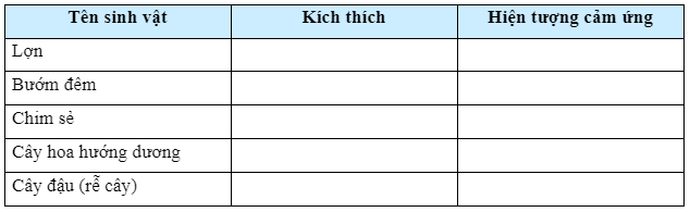 Quan sát các hiện tượng cảm ứng của một số sinh vật thường gặp trong thực tiễn và hoàn thành các thông tin vào bảng theo mẫu sau: