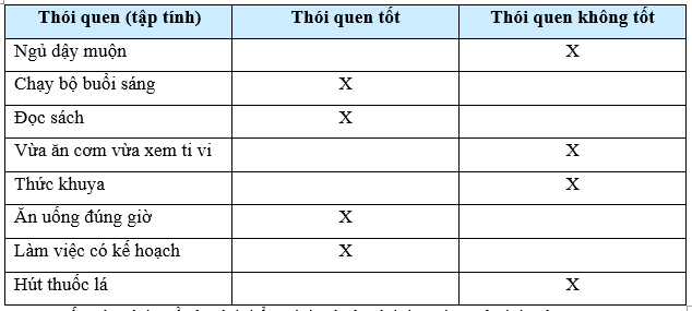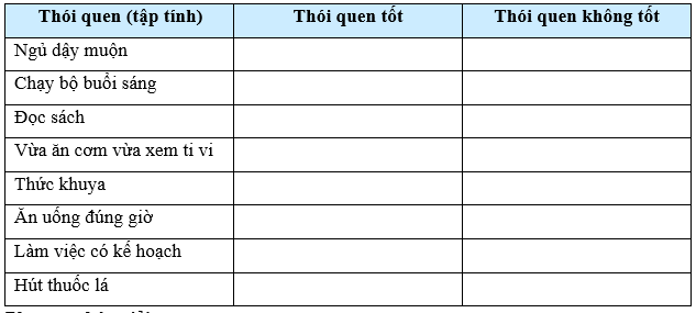 Hãy phân biệt các thói quen trong bảng sau vào nhóm thói quen tốt và không tốt. Lập kế hoạch để hình thành các thói quen tốt mà bản thân chưa có.