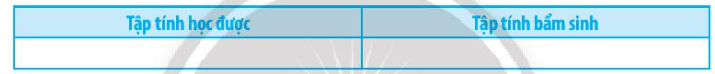 Hãy sắp xếp các tập tính dưới dây vào bảng để phân biệt tập tính học được và tập tính bẩm sinh. (1) Khi lỡ chạm tay vào nước nóng, con người liền rụt tay lại. (2) Khi bị ngã đau, em bé khóc. (3) Ếch sinh sản vào mùa mưa. (4) Chủ động khai báo ý tế khi đi về từ vùng có dịch bệnh lây nhiễm. (5) Chim mẹ mớm mồi cho chim non. (6) Cá nổi lên mặt nước khi nghe tiếng chuông. (7) Bạn học sinh thức dậy vào 5 giờ sáng mỗi ngày. (8) Em cảm thấy buồn ngủ vào lúc 10 giờ tối. (9) Em học thuộc bài thơ bằng cách đọc lại nhiều lần. (10) Con người tiết nước bọt khi nhìn thấy quả khế chua. ![]() |