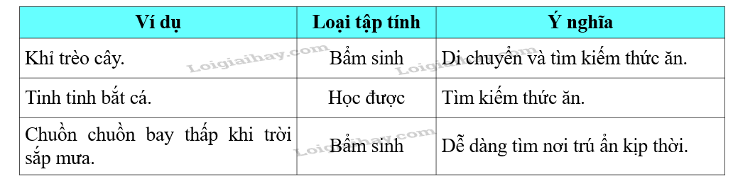 Hãy nêu ba ví dụ về tập tính ở động vật. Hãy cho biết những tập tính đó hình thành khi nào và nêu ý nghĩa của mỗi tập tính đó đối với động vật. |