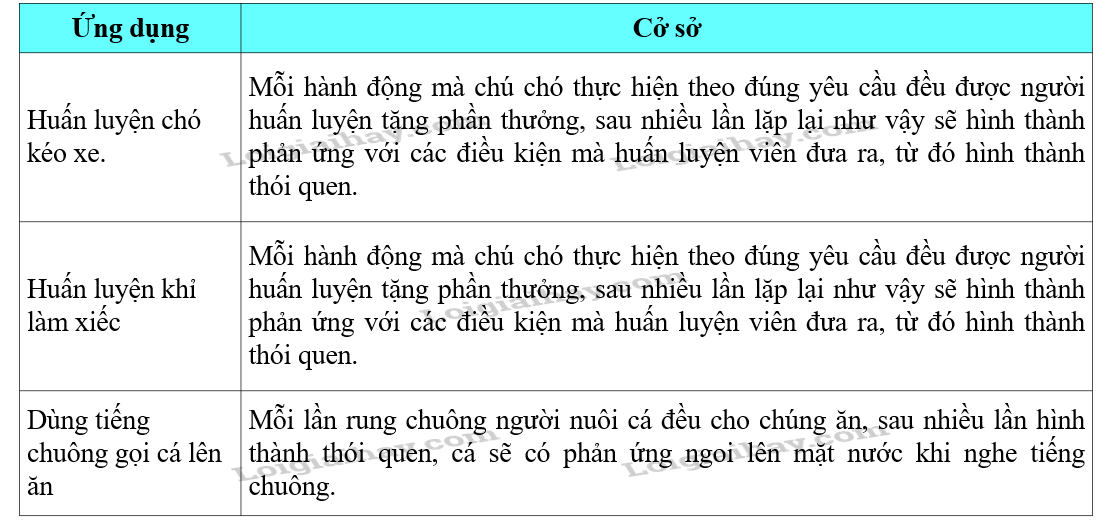 Giải thích cơ sở của các ứng dụng sau đây: huấn luyện chó kéo xe, huấn luyện khỉ làm xiếc, dùng tiếng chuông gọi cá lên ăn. |