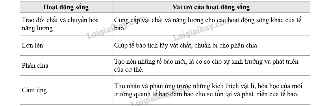 1. Các hoạt động sống xảy ra trong tế bào và vai trò của mỗi hoạt động sống đó: