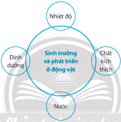 Hãy điền tên các nhân tố ảnh hưởng đến sinh trưởng và phát triển của động vật vào sơ đồ trên.