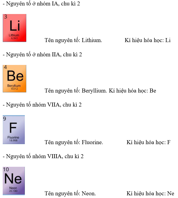 Viết kí hiệu và tên của các nguyên tố thuộc nhóm IA, IIA, VIIA và VIIIA ở chu kì 2.