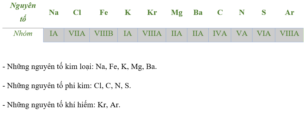 Dựa vào bảng tuần hoàn, hãy cho biết trong số các nguyên tố: Na, Cl, Fe, K, Kr, Mg, Ba, C, N, S, Ar, những nguyên tố nào là kim loại? Những nguyên tố nào là phi kim? Những nguyên tố nào là khí hiếm?