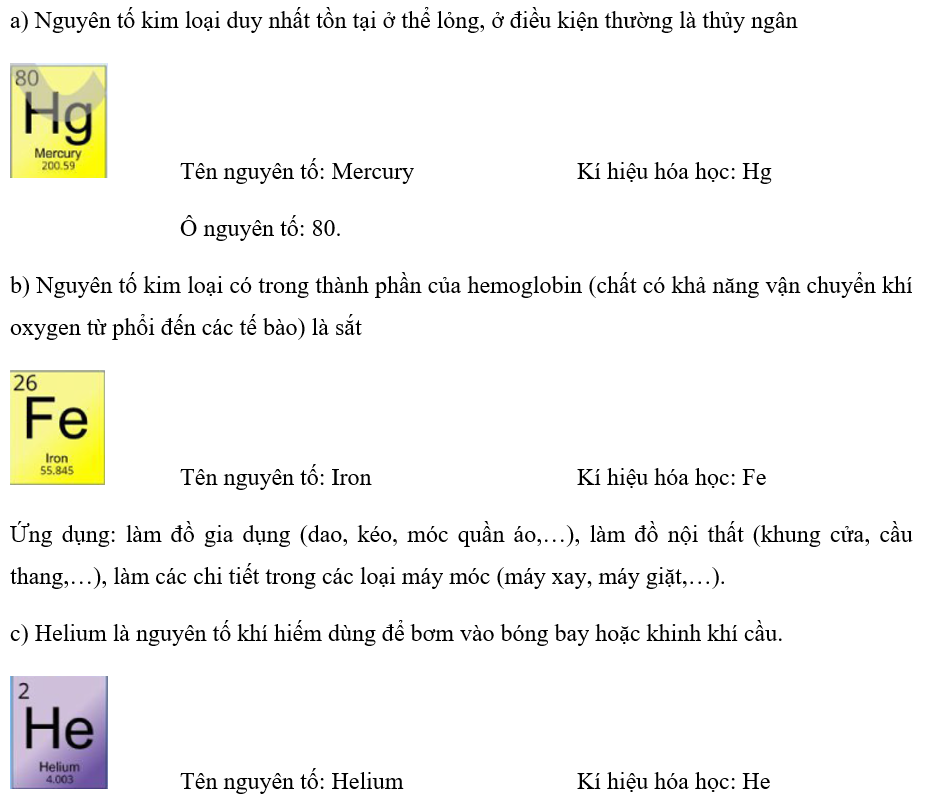 b) Tên và kí hiệu của nguyên tố kim loại có trong thành phần của hemoglobin (chất có khả năng vận chuyển khí oxygen từ phổi đến các tế bào), nếu thiếu nguyên tố này cơ thể chúng ta sẽ mắc bệnh thiếu máu. Hãy kể ra ít nhất 3 ứng dụng trong đời sống của nguyên tố kim loại đó,