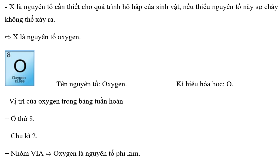X là nguyên tố cần thiết cho quá trình hô hấp của sinh vật, nếu thiếu nguyên tố này sự cháy không thể xảy ra. Hãy cho biết tên, kí hiệu và vị trí (ô nguyên tố, chu kì, nhóm) của X trong bảng tuần hoàn. Nguyên tố X là kim loại, phi kim hay khí hiếm?