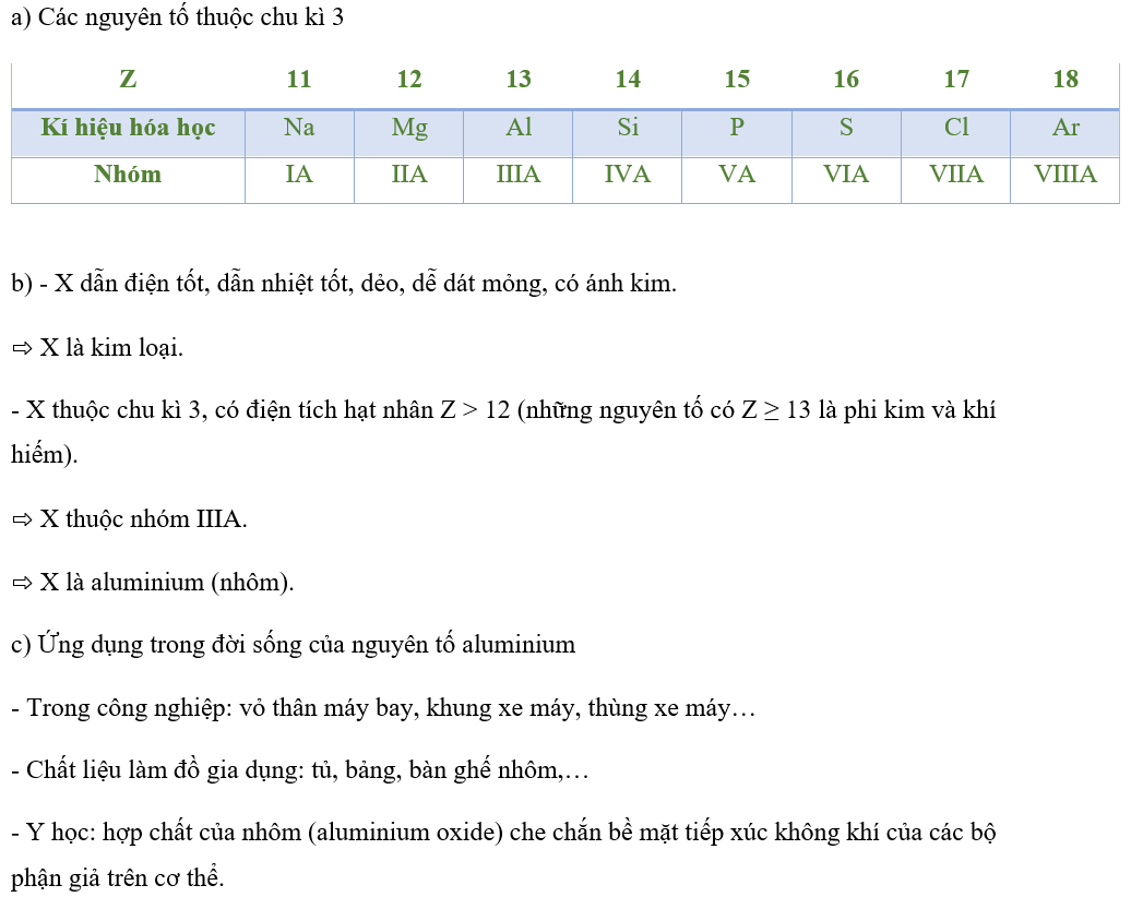 b) Hãy xác định tên và kí hiệu nguyên tố X biết nó thuộc chu kì 3, có điện tích hạt nhân Z > 12, dẫn điện tốt, dẫn nhiệt tốt, dẻo, dễ dát mỏng, có ánh kim. Giải thích.