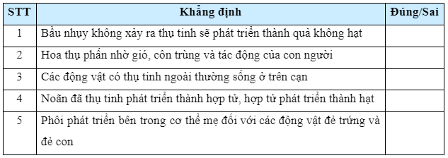 Trong sinh sản hữu tính ở thực vật, giao tử đực được hình thành trong …(1)…, giao tử cái được hình thành trong …(2)… Quá trình vận chuyển hạt phấn đến bầu nhụy là …(3)… Thụ tinh là quá trình kết hợp giữa giao tử đực và giao tử cái tạo thành …(4)… Hợp tử phân chia và phát triển thành phôi nằm trong hạt. Bầu nhụy biến đổi thành quả chứa hạt, …(5)… do noãn phát triển thành.