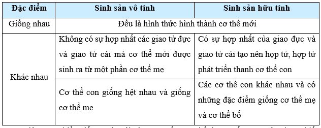 So sánh hình thức sinh sản vô tính và sinh sản hữu tính ở sinh vật theo mẫu bảng sau: