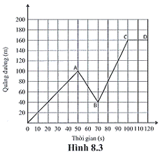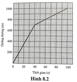 Hình 8.2 là đồ thị quãng đường – thời gian của xe buýt trong một phần hành trình. Trên đồ thị, hãy đánh dấu giai đoạn mà xe buýt chuyển động nhanh hơn giai đoạn còn lại.