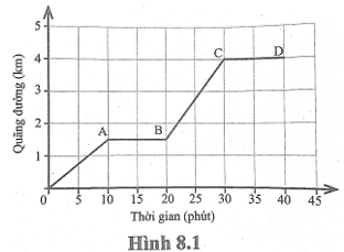 Tuấn rời nhà đi tới trường với tốc độ không đổi. Sau khi đi được một đoạn, Tuấn nghĩ rằng mình để quên chiếc bút nên quay về nhà để lấy nó. Tuy nhiên, khi đang về nhà, Tuấn kiểm tra lại thì thấy bút đang nằm trong cặp sách của mình nên tiếp tục đi đến trường. Để kịp giờ đến trường, Tuấn đã đi nhanh hơn. Hãy chỉ ra từng giai đoạn trong hành trình đến trường của Tuấn tương ứng với đoạn thẳng nào trên đồ thị hình 8.3.
