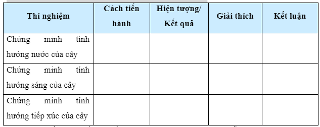 Em hãy thiết kế thí nghiệm chứng minh tính hướng nước, hướng sáng, hướng tiếp xúc của thực vật. Trình bày cách tiến hành, dự đoán kết quả, giải thích hiện tượng quan sát được rồi hoàn thành thông tin vào bảng theo mẫu sau:
