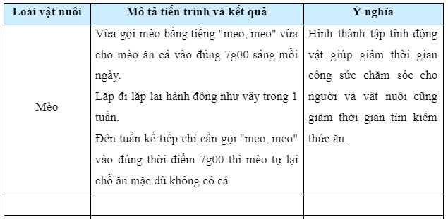 Thực hành hình thành tập tính học được cho vật nuôi: Hình thành thói quen ăn uống đúng giờ cho một số vật nuôi phổ biến như chó, mèo, lợn, gà, cá,… theo trình tự các bước sau: