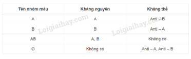 Nêu tên kháng nguyên và kháng thể của mỗi loại nhóm máu A, B, AB, O.