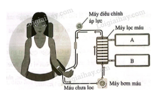 Hình dưới thể hiện nguyên lí hoạt động của máy chạy thận nhân tạo. Dung dịch A hay dung dịch B chứa chất thải? Giải thích.