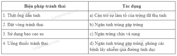 Ghép nổi tên biện pháp tránh thai và tác dụng tương ứng của biện pháp đó