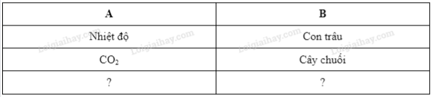 Hãy cho biết các nhân tố sinh thái ở Cột A và Cột B trong bằng dưới đây thuộc nhóm nhân tố sinh thái nào? Hãy lấy thêm ví dụ các nhân tố sinh thái ở hai cột.