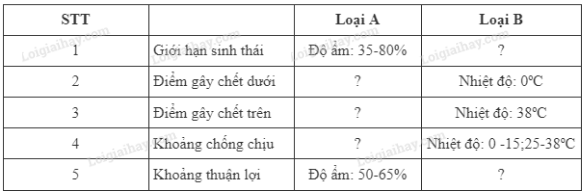 Xác định các thông tin còn thiếu trong Bảng 41.3. Từ đó vẽ sơ đồ mô tả giới hạn sinh thái của các loài sinh vật đó.